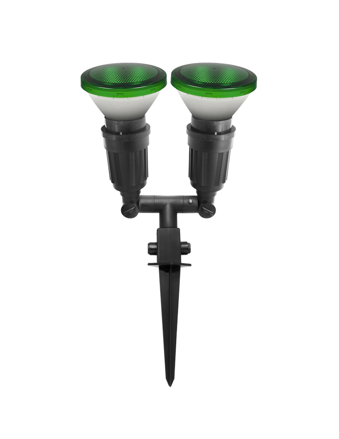 Proyector de jardín fabricado en ABS, cuenta con dos portalámparas E27 está diseñado para la instalación de una lámpara LED PAR38. Medidas: 75x450 mm. Gracias al pincho se puede anclar en grava, arena, tierra, etc. 20 uds.