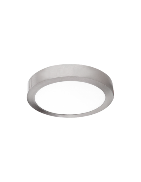 Downlight de superficie fabricado en aluminio y policarbonato en níquel. Cuenta con un LED SAN'AN SMD 2835, unas medidas exteriores de Ø120x35mm y un ángulo de apertura de 120º. Incluye driver LED Isolated. FP 0.6