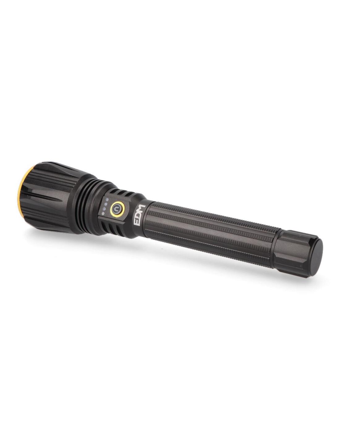 Linterna led táctica de largo alcance, 10000 lm, 6500 k, 100 w, zoom, modos: turbo 10000 lm 30 s 200 m, high 6000 lm 1,5 h 160 m, medium 2000 lm 5 h 90 m, low 250 lm 8 h 30 m. batería 21700 7,4 v 4000 mah, recargable usb-c con cable incluido, indicador de carga, función power bank 5 v 1 a, tiempo de carga 5 h. cuerpo en aluminio, ipx4. dimensiones: ø64 mm x 288 mm. presentado en expositor de 4 uds