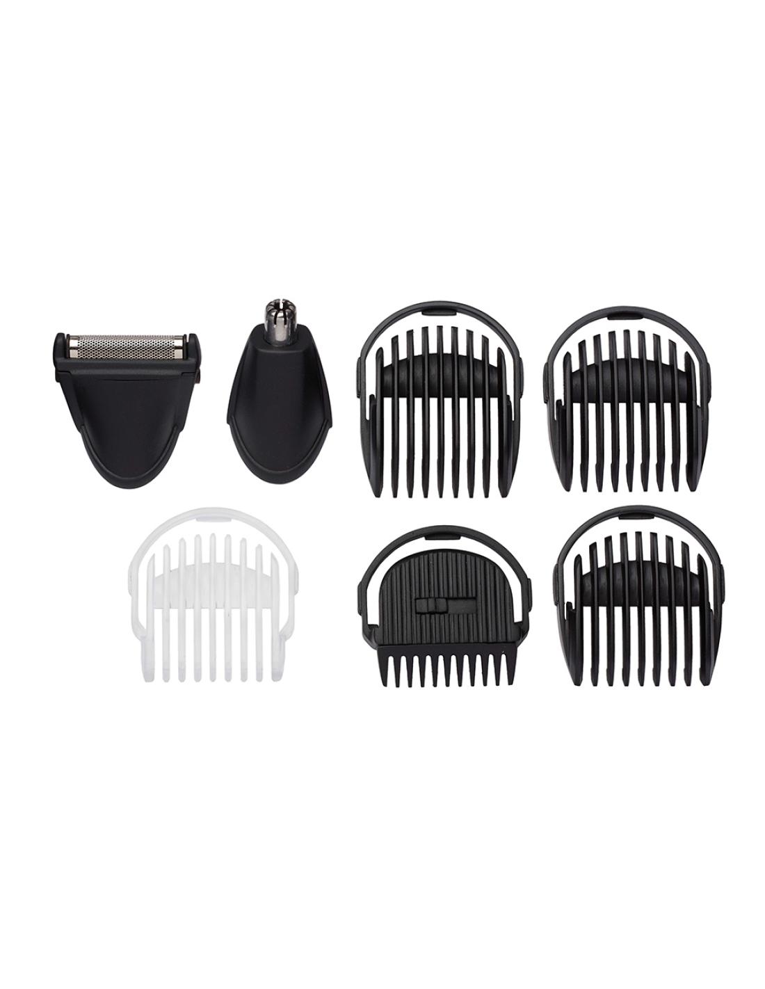 Multigroom 6 en 1 mt725e babyliss. cuchillas de acero inoxidable, cuchillas de 34mm, uso sin cable de 60 minutos de autonomía, 8h de carga. 1 cabezal de mantenimiento "barba 3 días" de 1mm a 3,5mm. 3 cabezal para barba (5,6 y 7mm), naricero y orejero. incluye bolsa de almacenamiento y cepillo de limpieza. garantía de 3 años.