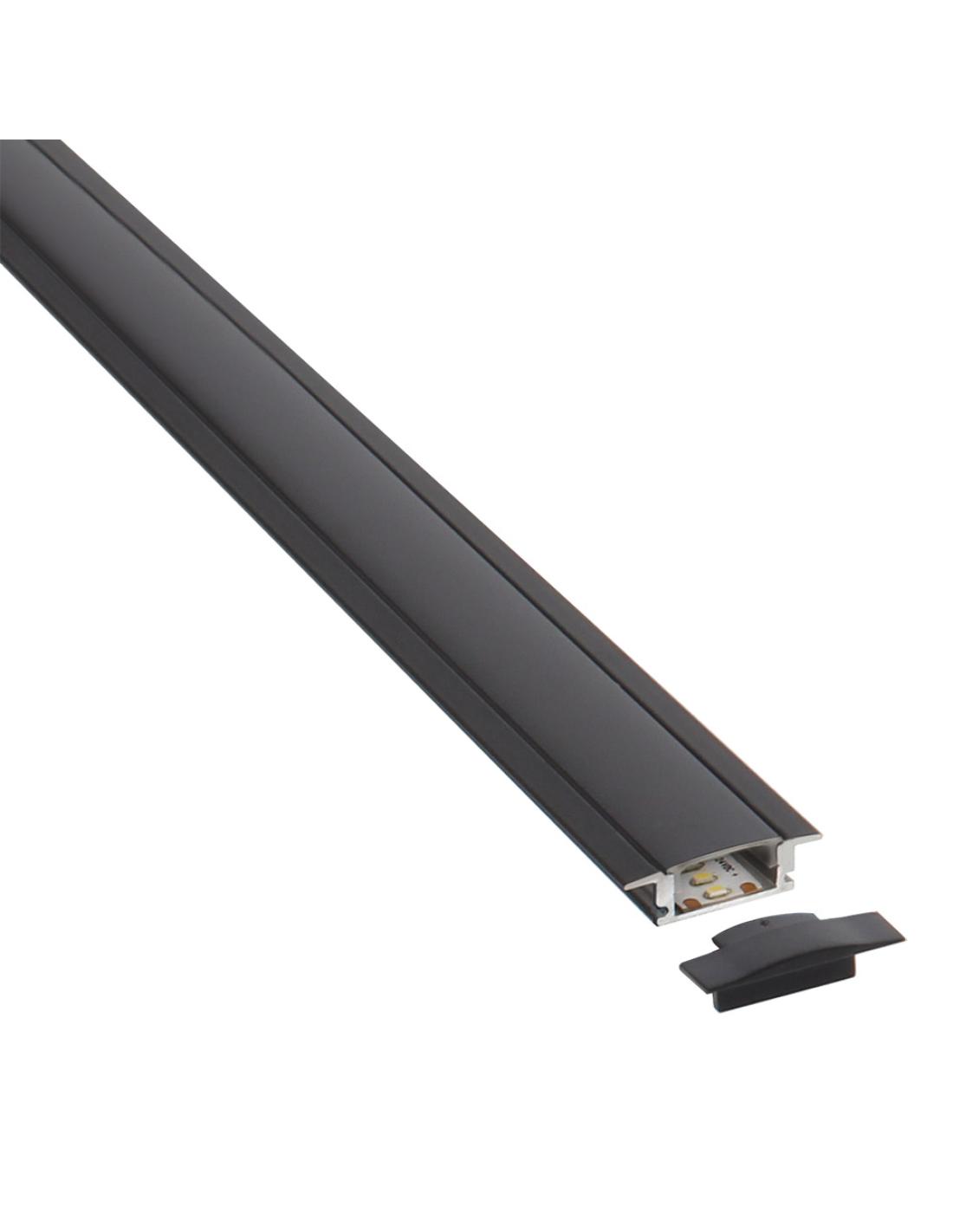 Kit que incluye perfil de aluminio lacado de color negro de 2 metros, cubierta negra y tapas laterales.