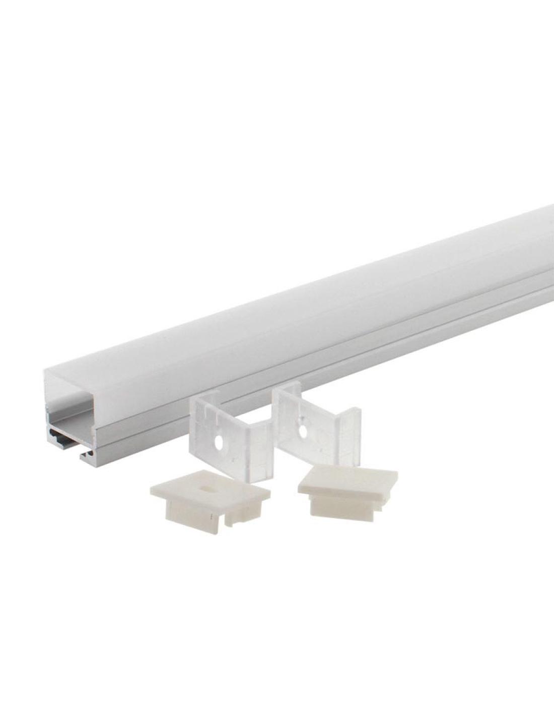 Kit que incluye perfil de aluminio anodizado de 2 metros ALKAL, cubierta opal, tapas laterales y clips.