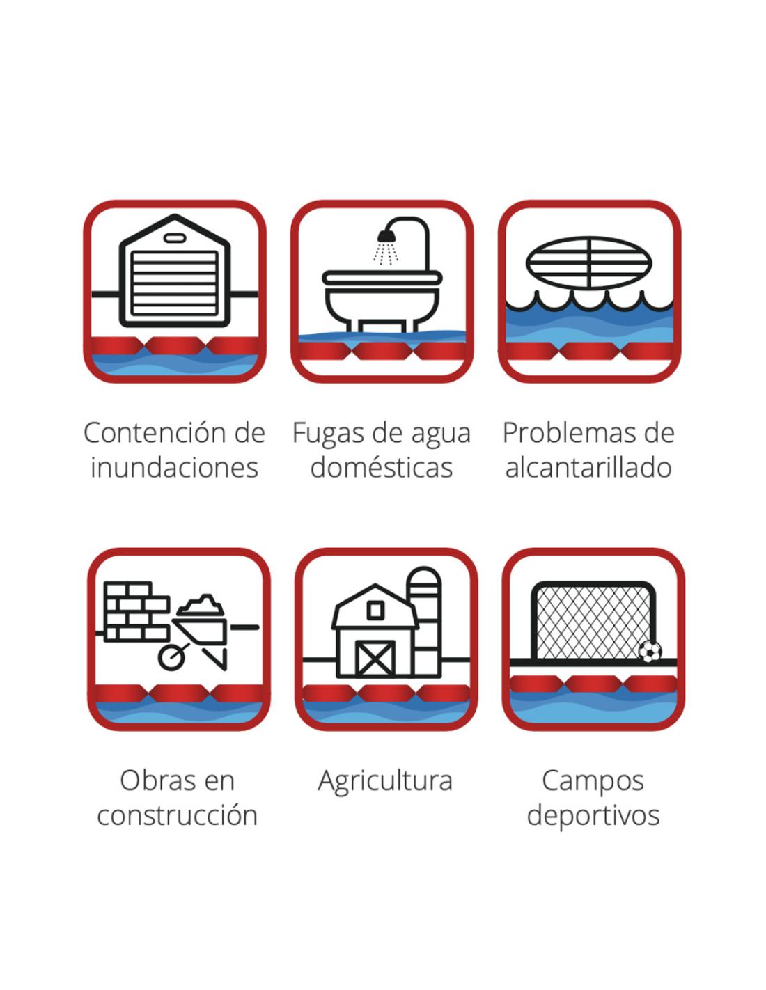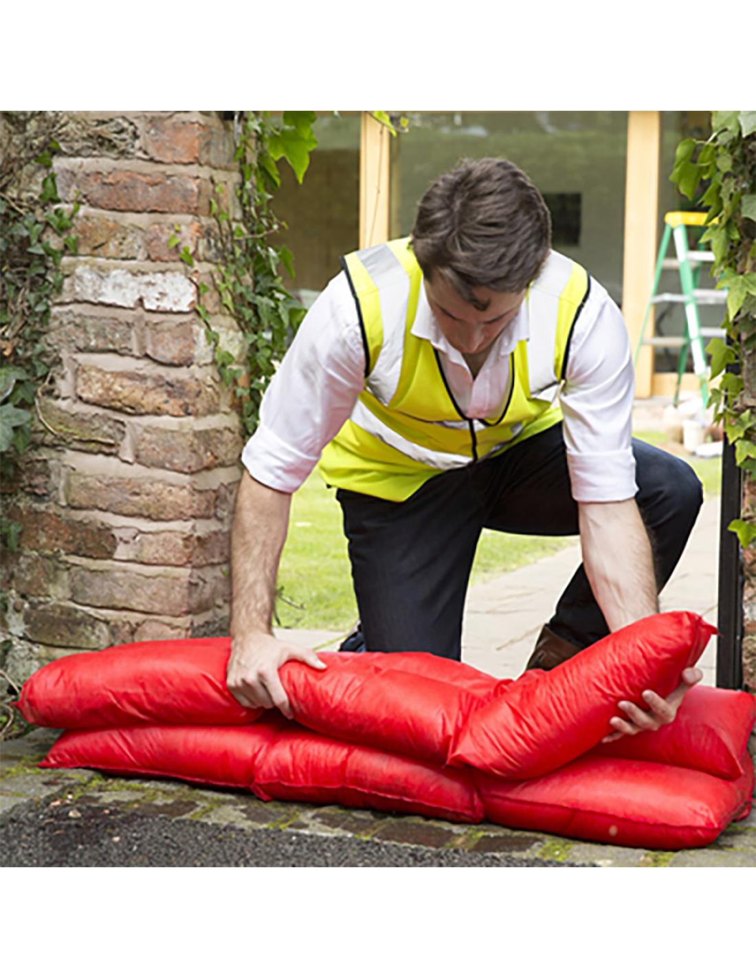 Saco/barrera de emergencia para la formación de barrera anti-inundaciones destinada a la absorción y a la redirección del agua. rellenos con un polímero súper absorbente inocuo en seco son ligeros (0,25 kg), fabricado con materiales 100% respetuosos con el medio ambiente color rojo, 145 x 25 cm