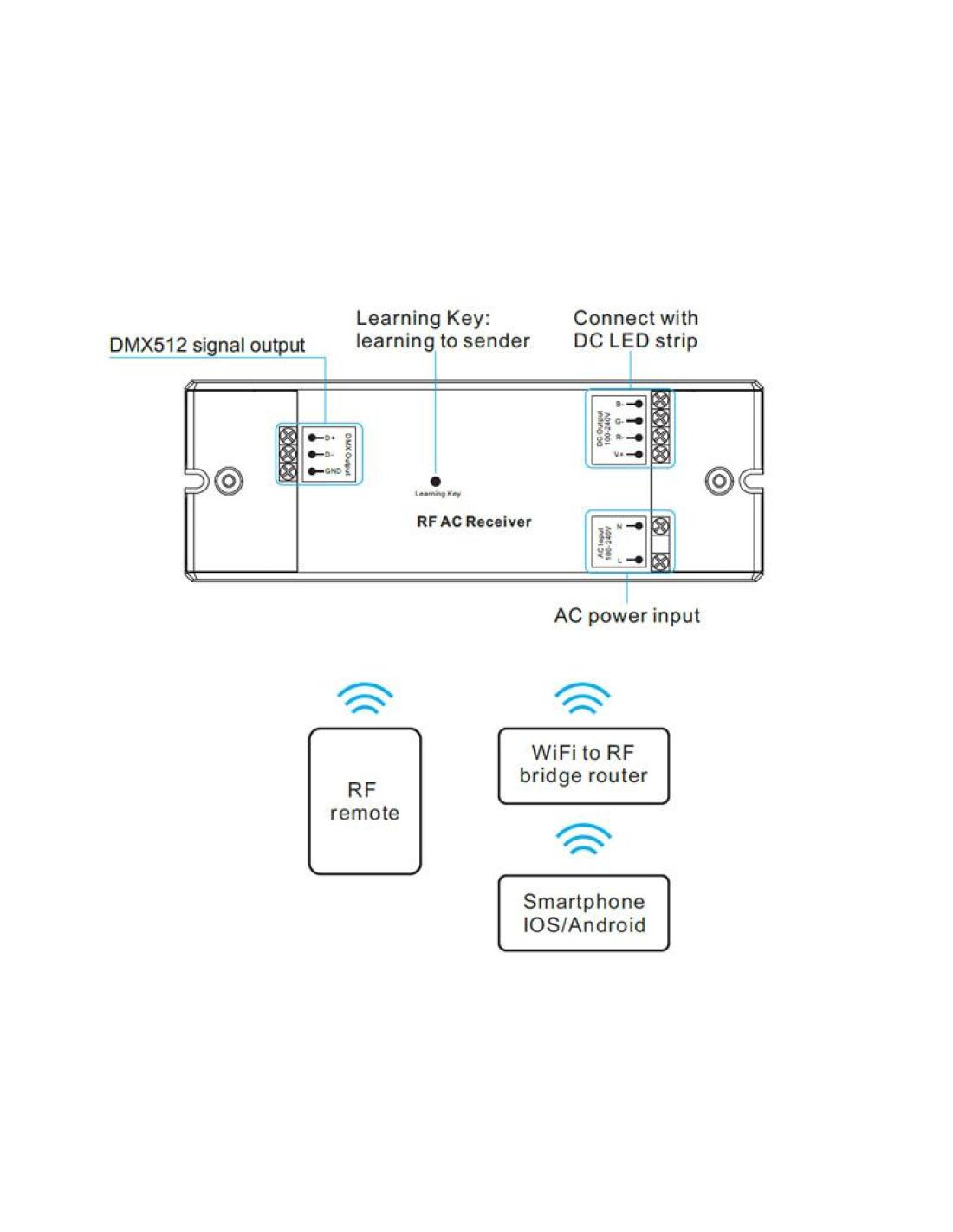 Controlador profesional que trabaja como receptor de diferentes emisores RF y transmisores WiFi. Salida DMX y control de 4 canales que permite controlar las tiras RGB o MONO de alto voltaje (220V).