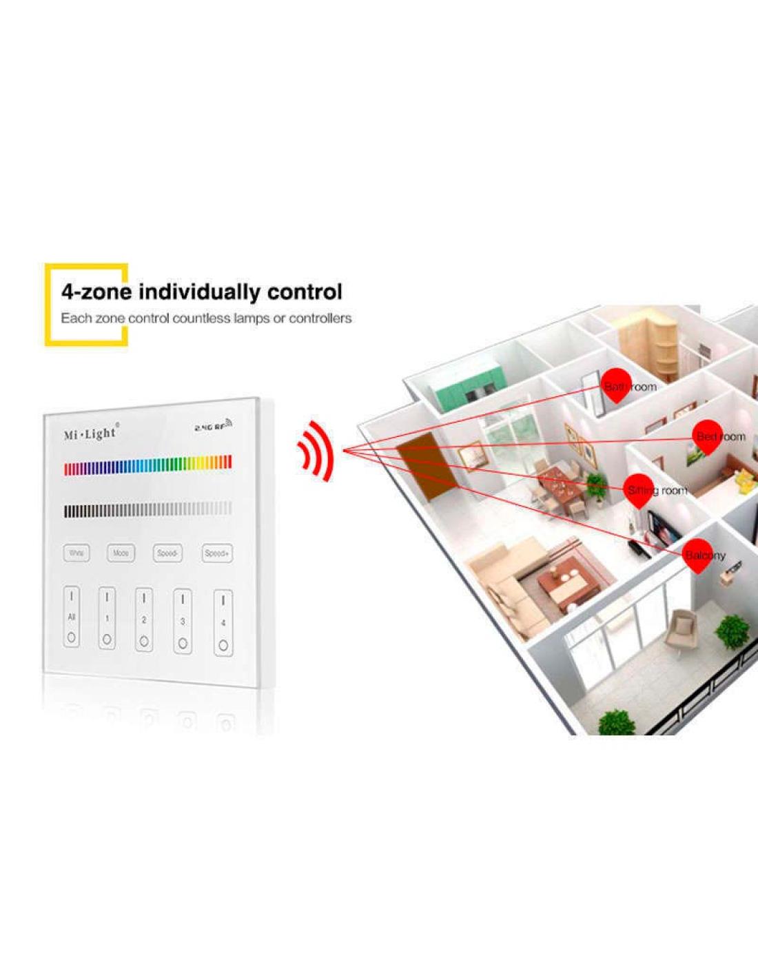 El Mando Táctil T3 es un control remoto empotrado de pared con pantalla de cristal táctil de gran precisión para un control profesional de tiras LED RGB/RGBW. Permite el control de 4 zonas independientes.
