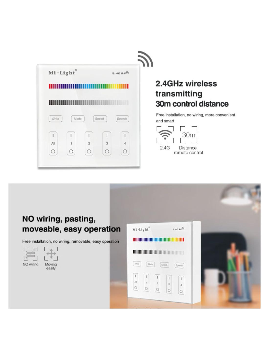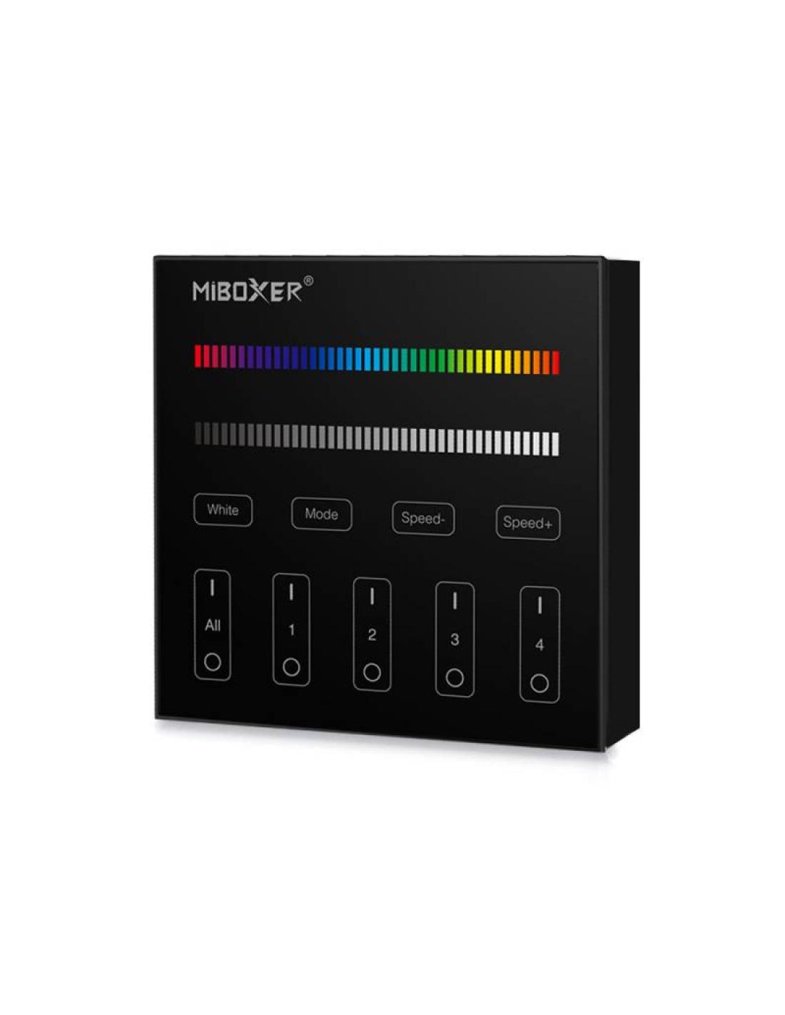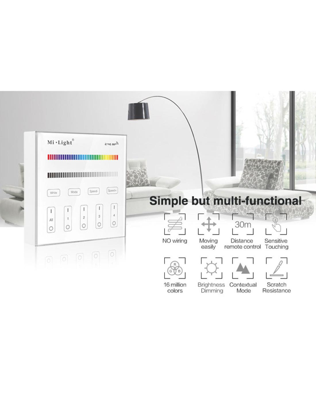 Control remoto de pared con pantalla de cristal táctil de gran precisión para un control profesional de tiras led RGB/RGBW. Permite el control de 4 zonas. Se alimenta con 2 pilas tipo AAA y es posible ponerlo en cualquier superfice sin necesidad de empotrarlo.