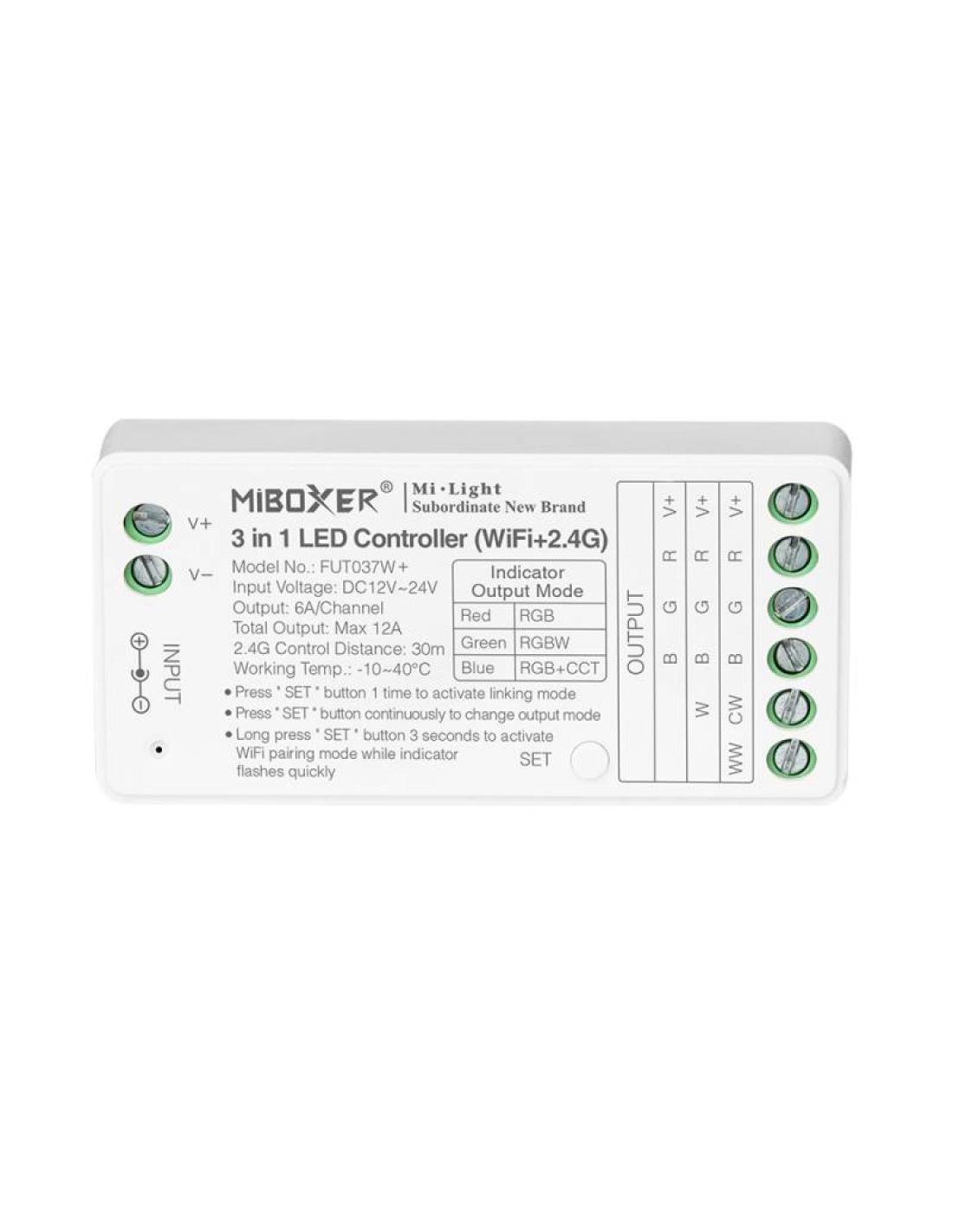 Controlador 3 en 1, controla tiras RGB / RGBW o RGB+CCT con el mismo controlador. Hasta 4 zonas diferentes de tiras led con una potencia de 12A (6A por canal). Con auto-transmisión entre los demás controladores con lo que se consiguen distancias sin límites y compatible con una amplia gama de mandos a distancia RF de mano, pared, APP, Wifi, Amazon Alexa y Google Assistant. Compatible con transmisor DMX.