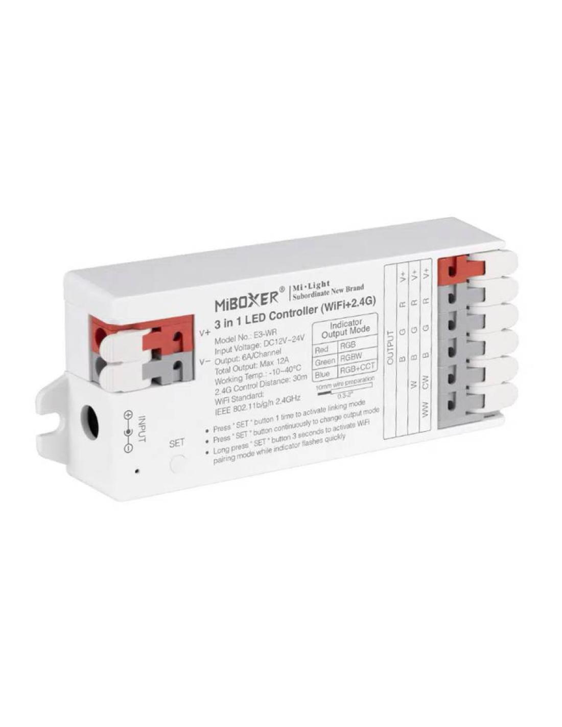 Controlador 3 en 1, controla tiras RGB / RGBW o RGB+CCT con el mismo controlador con conectividad WIFI y 2.4G RF.