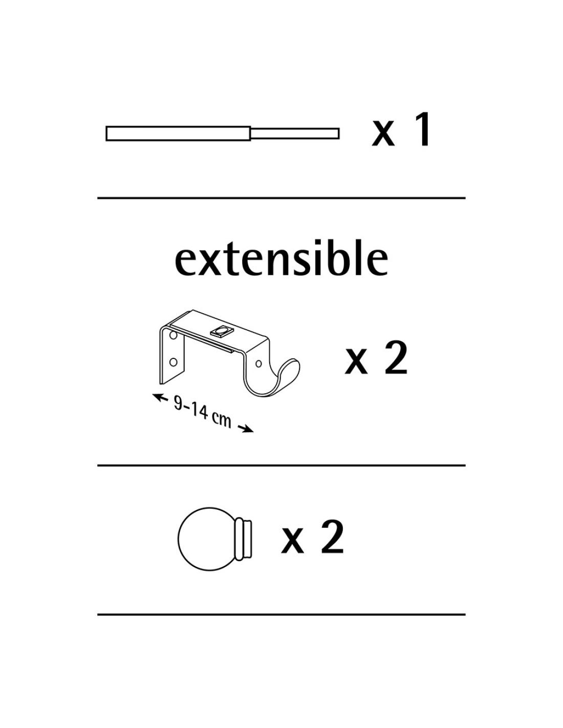 Kit barra cortina anillo extensible de 110 a 200cm negro stor planet. barras completas en formato de kit. contienen los componentes necesarios para la instalación : dos barras, 2 soportes extensibles con tacos y tornillos y 2 terminales (sin anillas). acabado satinado. instalación en pared. mantenimiento: limpieza con un paño seco.