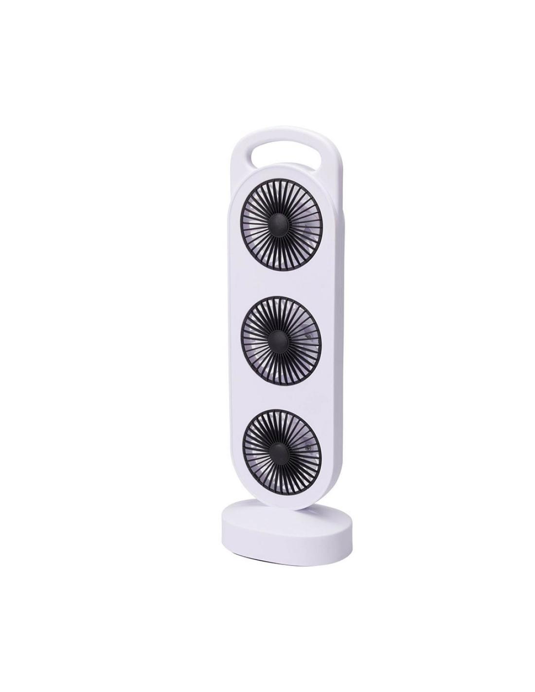 Ventilador de sobremesa, con 3 velocidades, recargable, fabricado en abs, con asa incorporada, batería de litio 18650 de 1200 mah 3,7 v. incluye cable de carga usb-c color blanco con detalles en negro