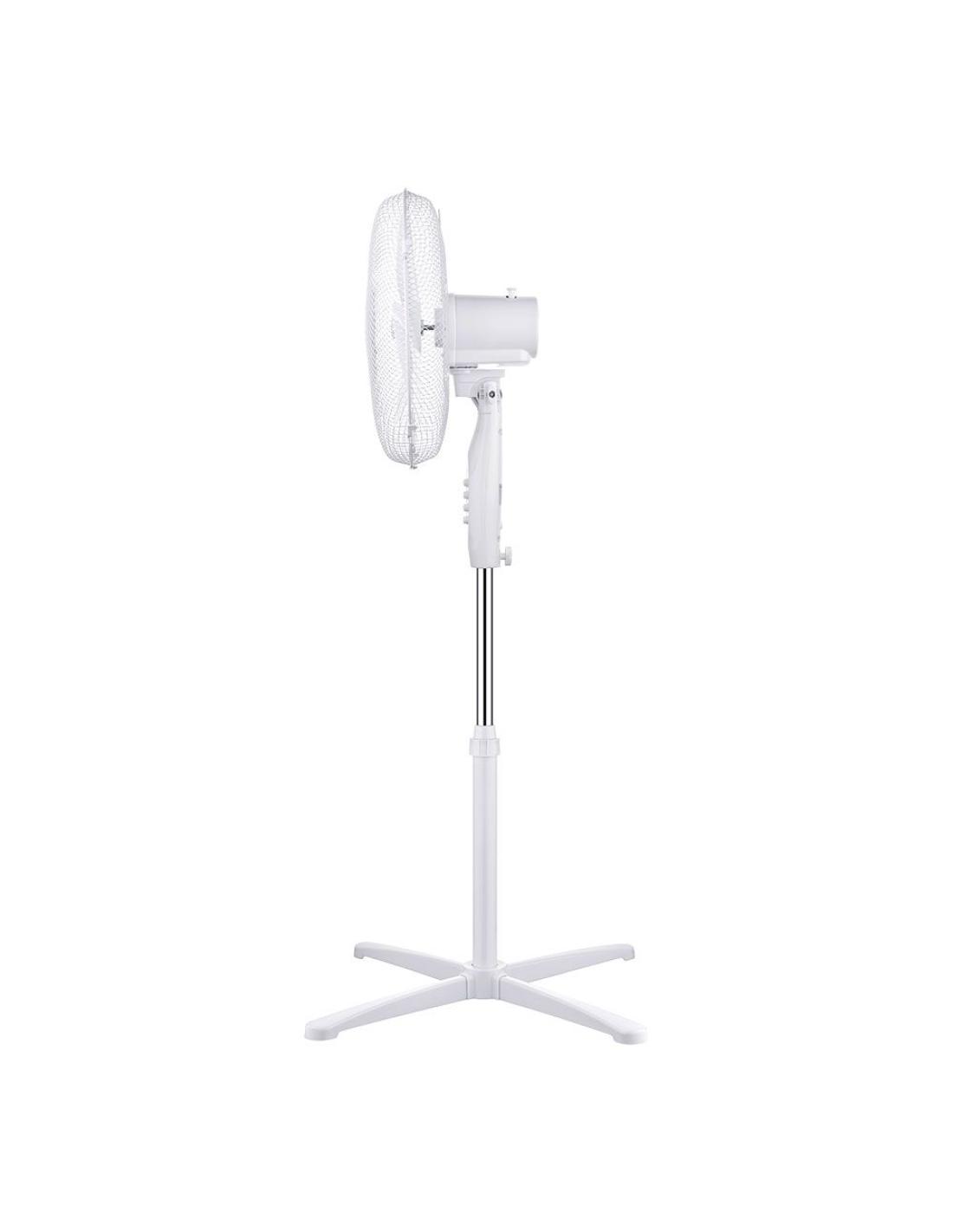 Ventilador de pie, blanco. potencia 38w 3 aspas de 36 cm altura regulable 98 - 122 cm. 3 velocidades de ventilación, con cabezal orientable de posición fija u oscilante, rejilla de seguridad, silencioso, base con 4 pies antideslizante de 62 cm. cable de alimentación de 1,5 m. flujo de aire máximo 3,130 m³/h. tensión 220-240 v~50hz